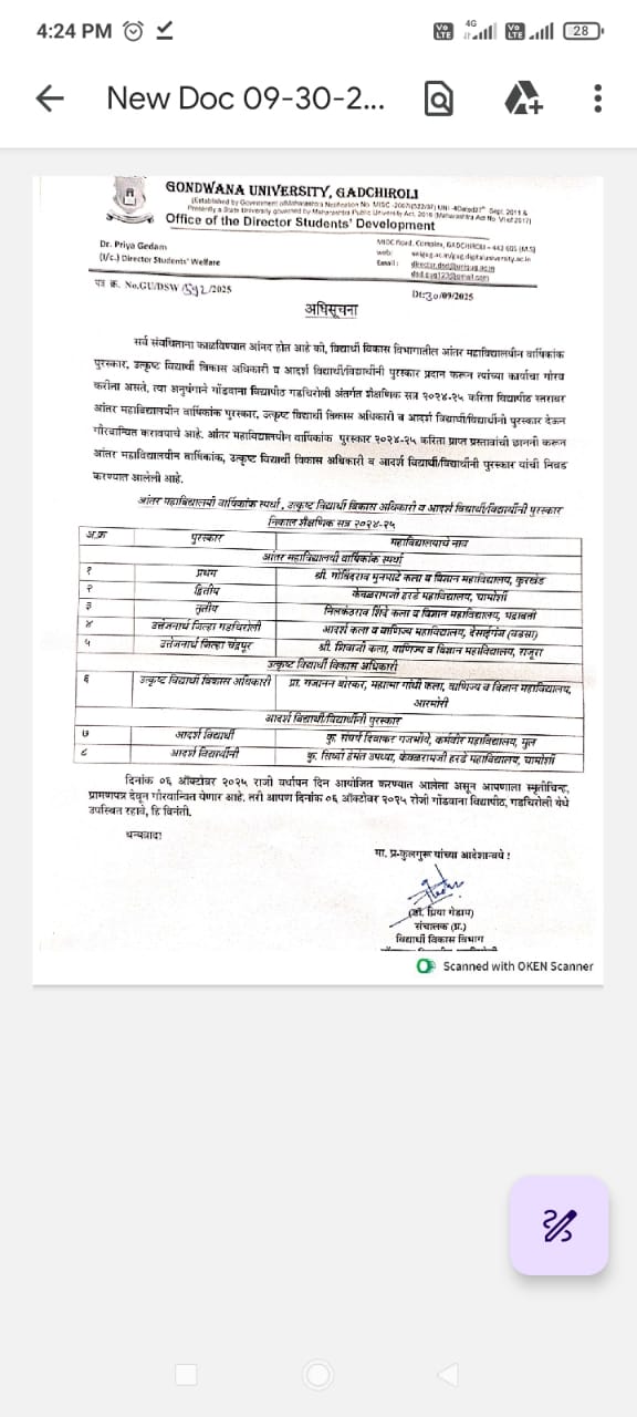 It gives me great pleasure to mention that, in affiliated colleges of Gondwana University, our college is the first who face third cycle of accreditation and NAAC conferred grade B with CGPA 2.58. Our college is recognized center for Higher Learning and Reaserch in four subject and number of students got Ph.D degree from these centres. Every year college publish a magazine named- Shabdashilp, which has been publishing finest and creative ideas on recent issues of nature and society by our students. We proud of the academic ambience, research output, sports and culture facilities and infrastructure that college provides to the students. Read More
