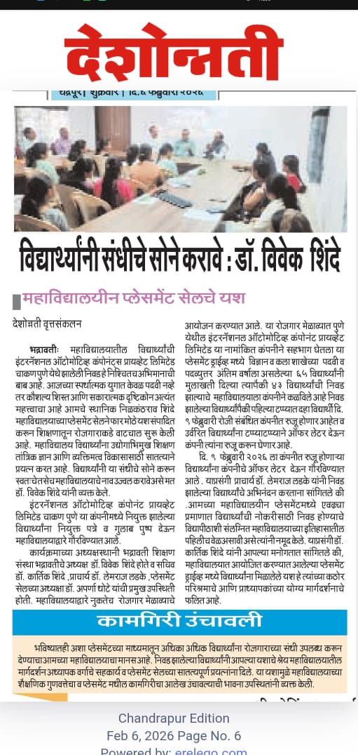 It gives me great pleasure to mention that, in affiliated colleges of Gondwana University, our college is the first who face third cycle of accreditation and NAAC conferred grade B with CGPA 2.58. Our college is recognized center for Higher Learning and Reaserch in four subject and number of students got Ph.D degree from these centres. Every year college publish a magazine named- Shabdashilp, which has been publishing finest and creative ideas on recent issues of nature and society by our students. We proud of the academic ambience, research output, sports and culture facilities and infrastructure that college provides to the students. Read More